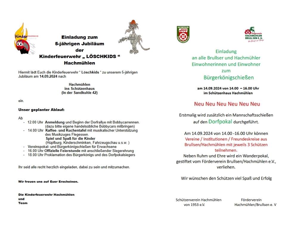 Die Kinder-Feuerwehr, der Schützenverein u. der Förderverein laden ein am Samstag, 14.9.2024